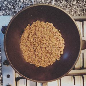 - Schep het gehakt uit de pan met de lepel met gaatjes zodat het allemaal niet te vochtig de schaal in gaat.